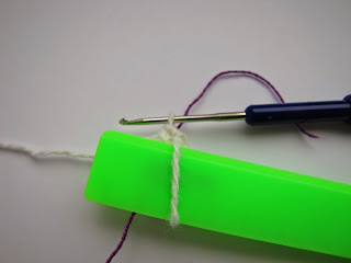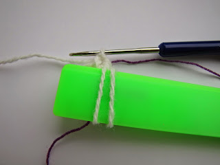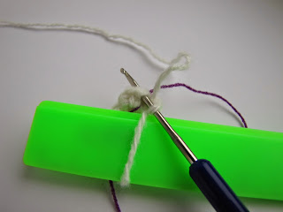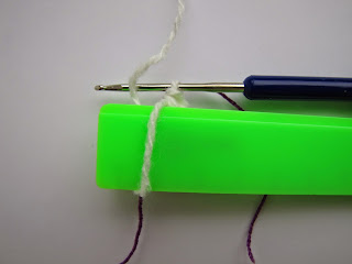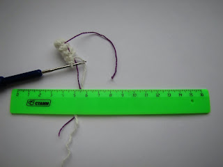 Берём линейку, накинуть нить на линейку. Затем вводим крючок в отверстие, за рабочей нитью, и, сделав накид, протянуть его в отверстие. На крючке получились две петли. Сделайте накид и провяжите вместе две петли, сидящие на крючке. Повторяем вязание вытянутыми петлями до конца ряда. Должен получиться ряд СБНс вытянутыми петлями.