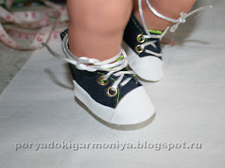 Собрала кеды. Тут делала на глаз, примеряя на куклу. Сначала все приметала, потом пристрочила подошву швом наружу.